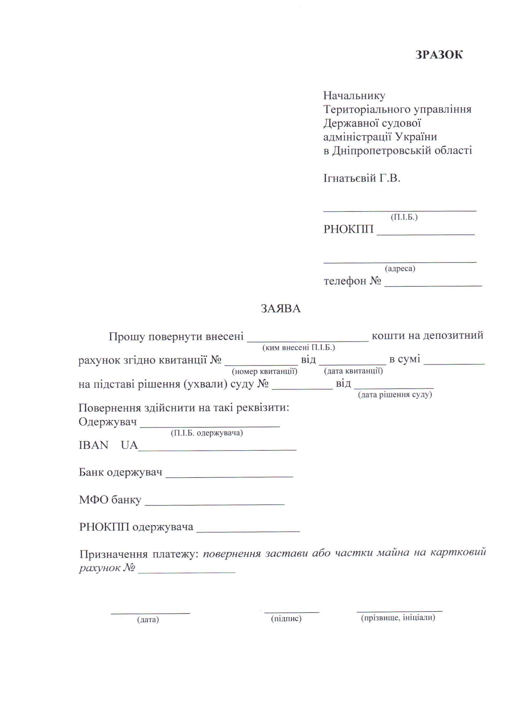 Реквізити депозитних рахкнків для зарахування коштів, внесених у вигляді застави (частки майна, попередньо визначеної суми судових витрат тощо) (ЗАСТАВА)