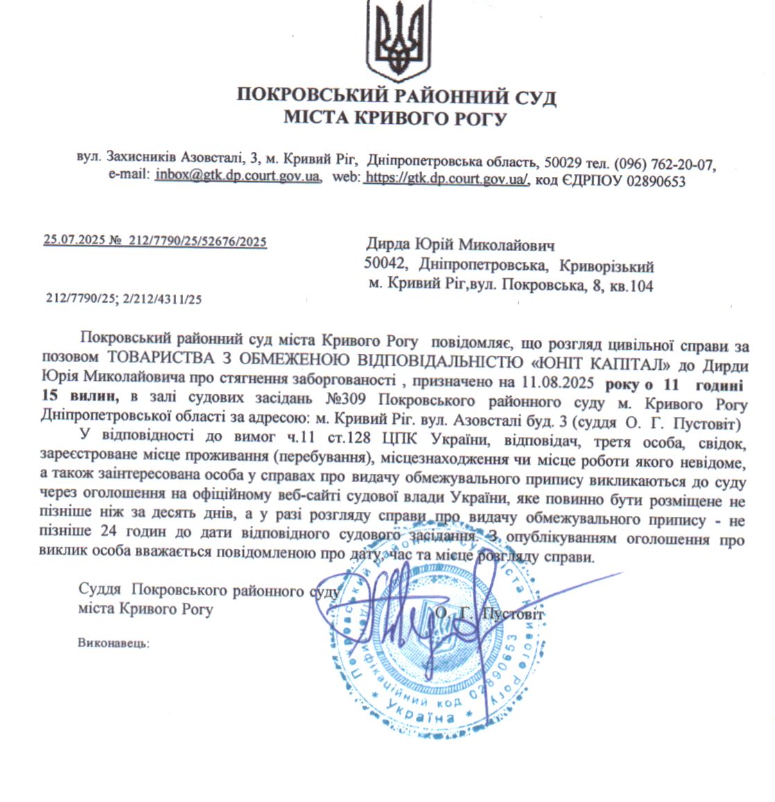 Оголошення про виклик до суду Дирди Юрія Миколайовича