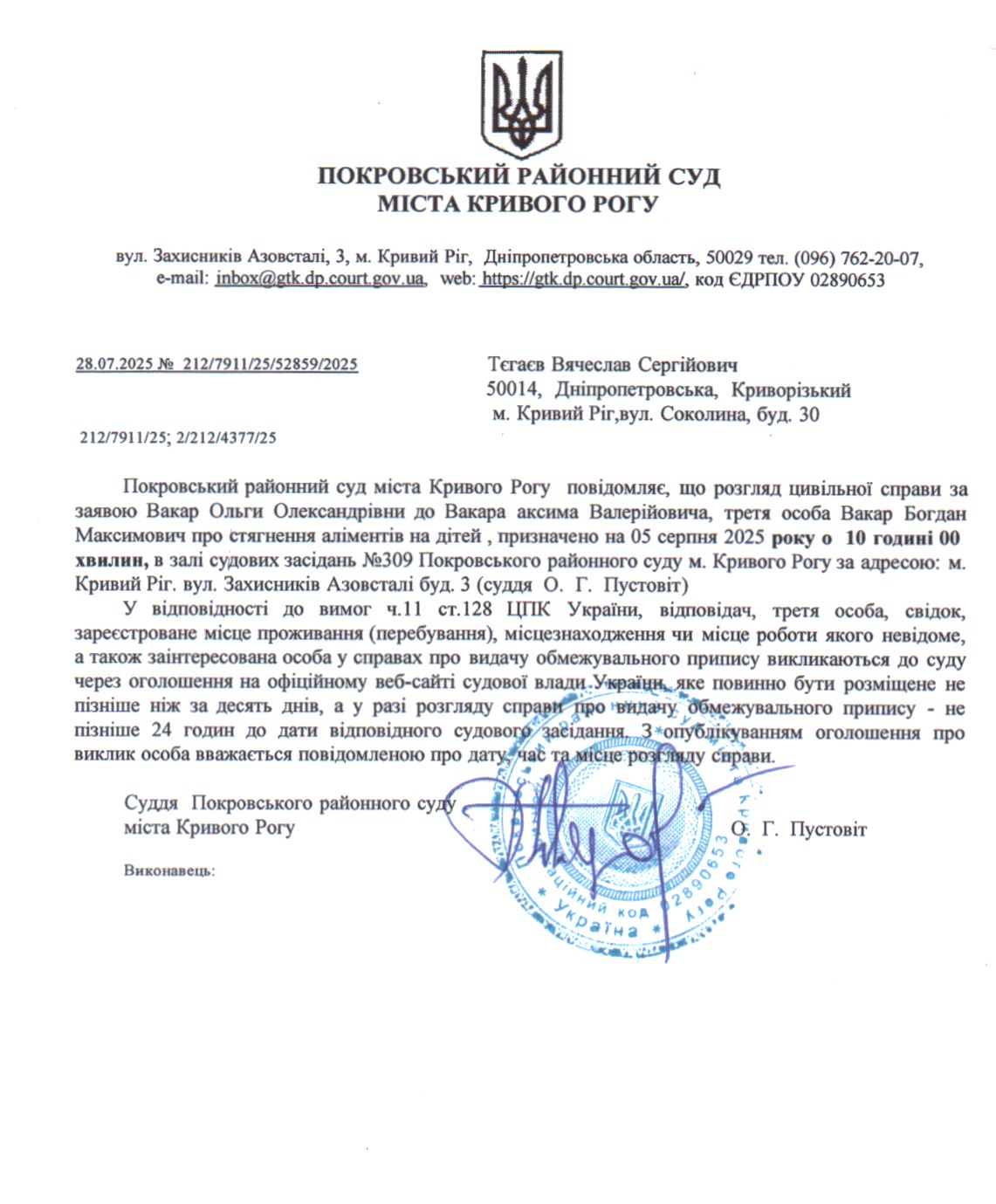 Оголошення про виклик до суду Тєгаєва Вячеслава Сергійовича