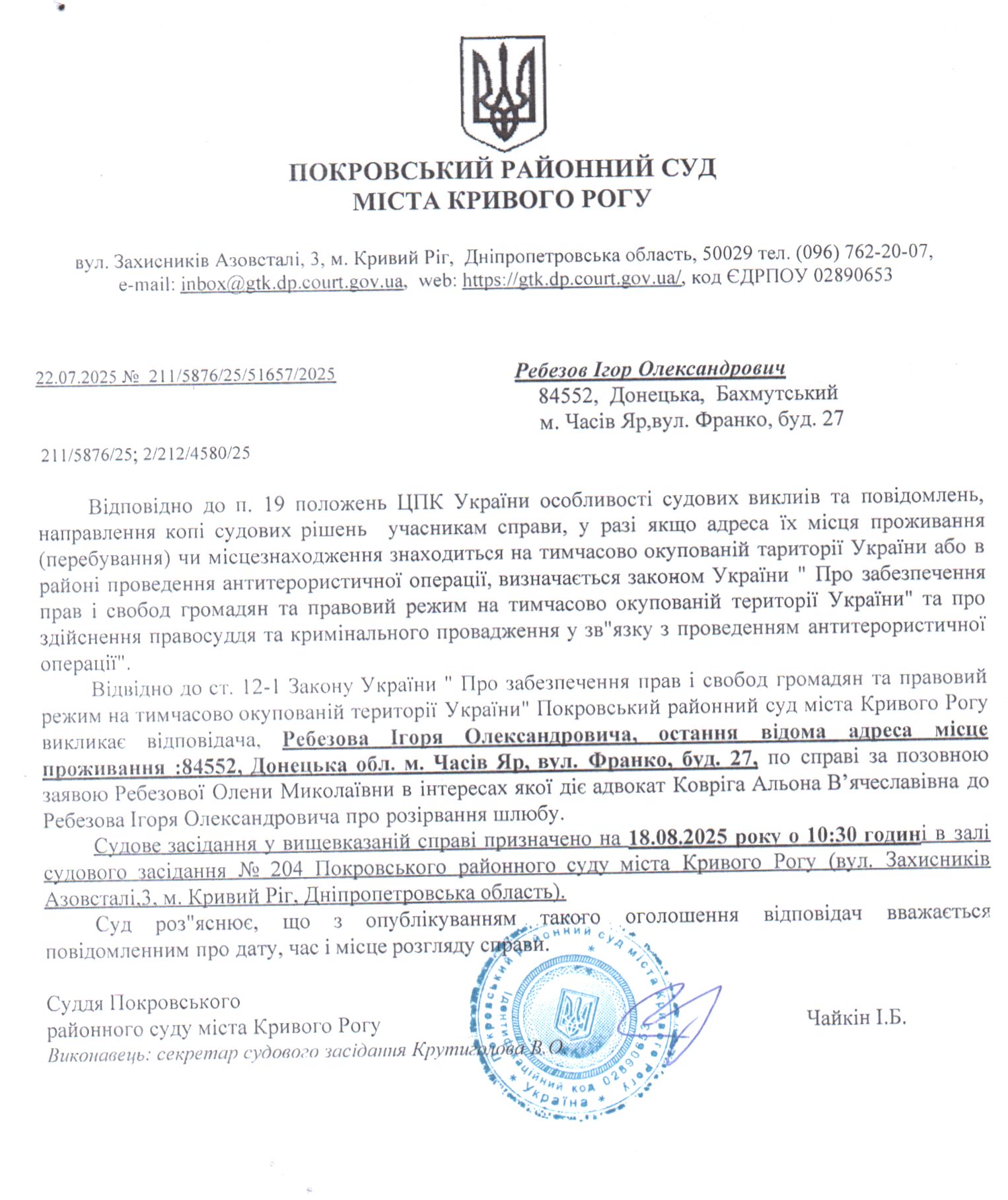 Оголошення про виклик до суду Ребезова Ігоря Олександровича