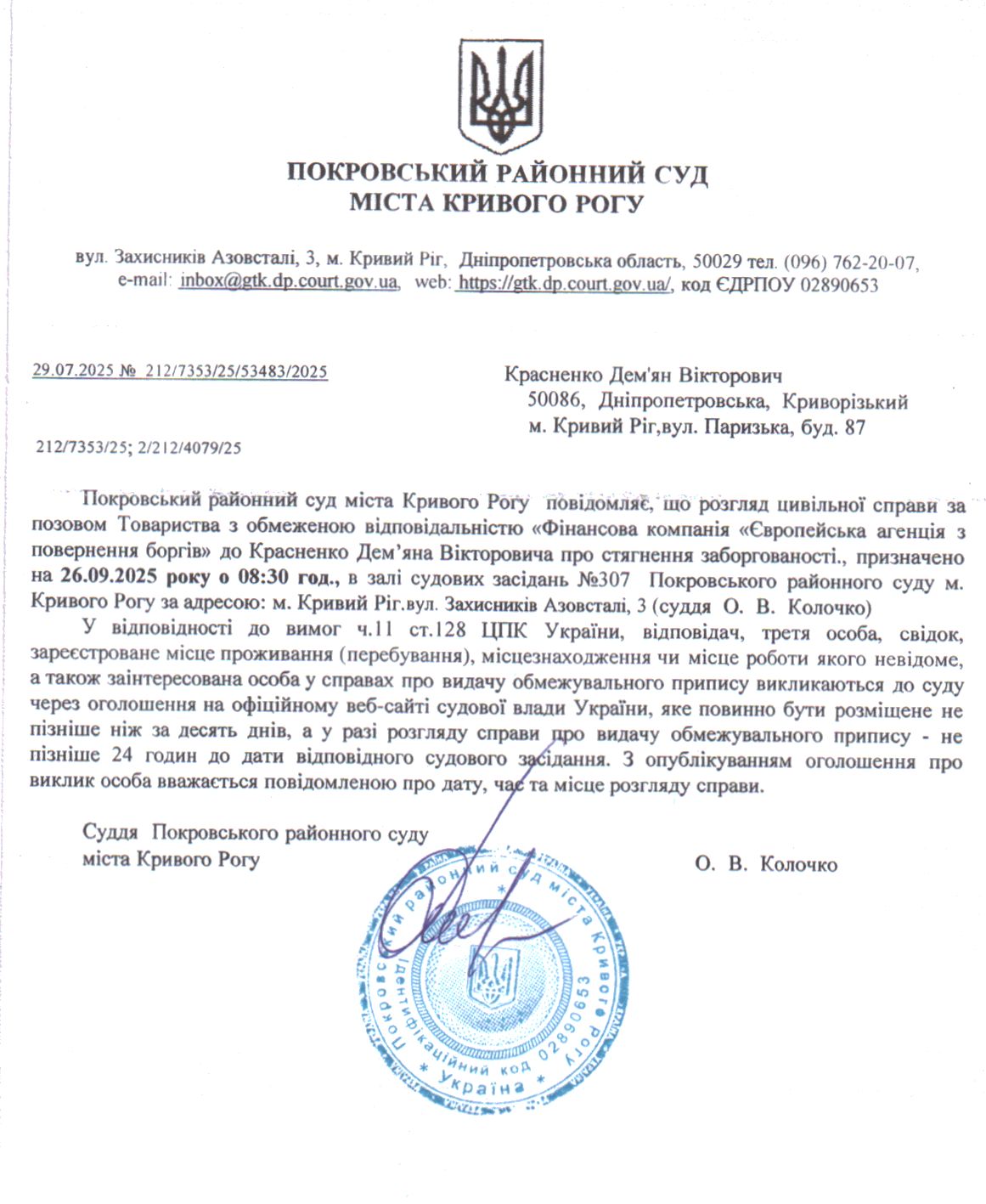 Оголошення про виклик до суду Красненка Дем'яна Вікторовича