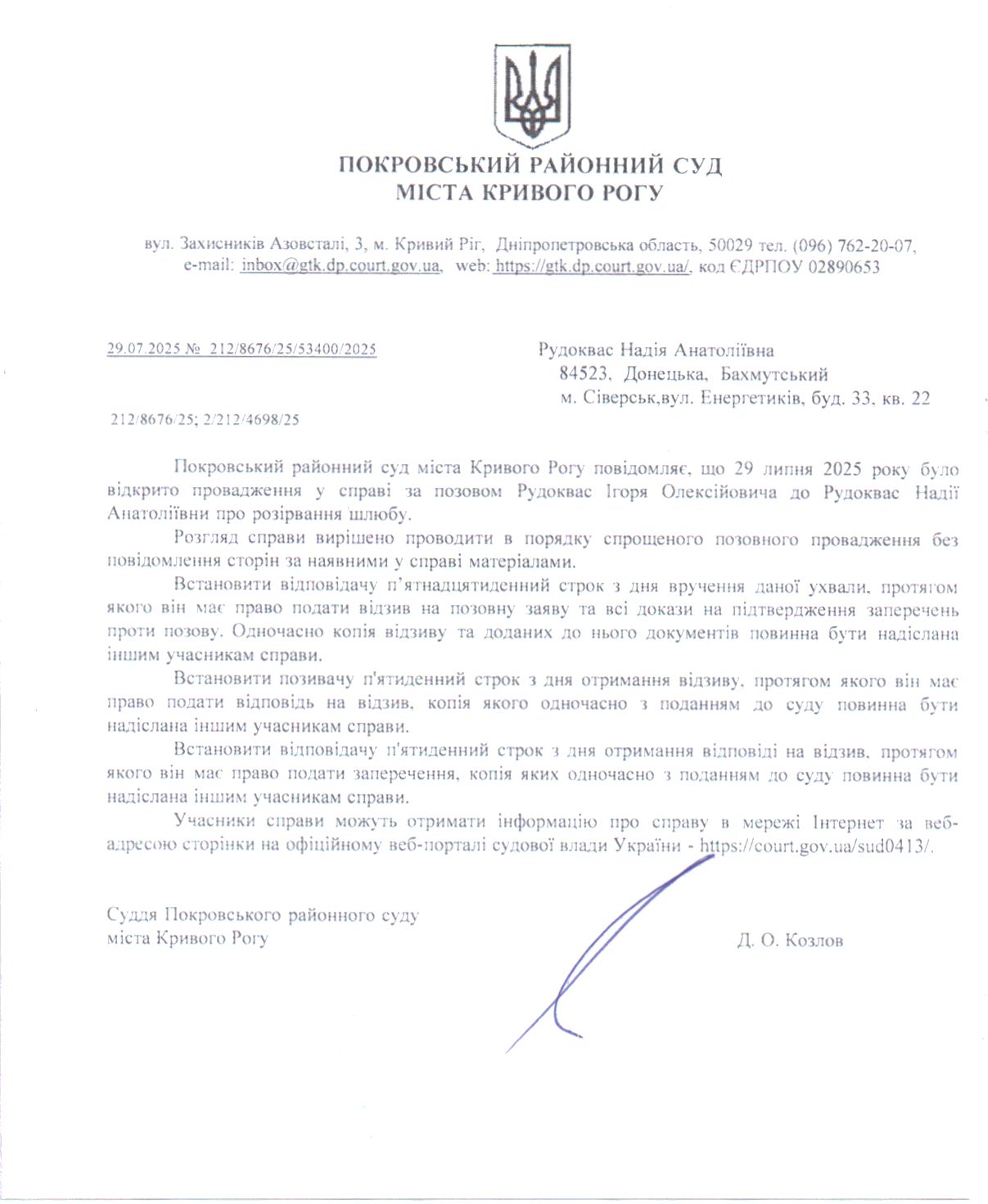 Оголошення про виклик до суду Рудоквас Надії Анатоліївни