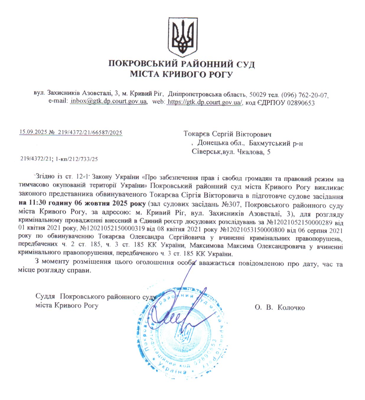 Оголошення про виклик до суду Токарєва Сергія Вікторовича