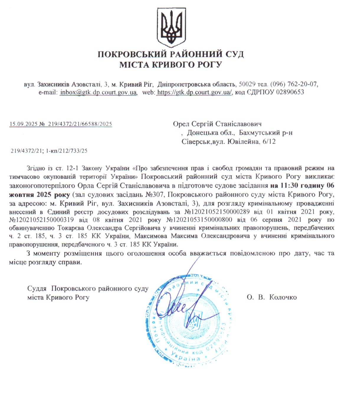 Оголошення про виклик до суду Орла Сергія Станіславовича