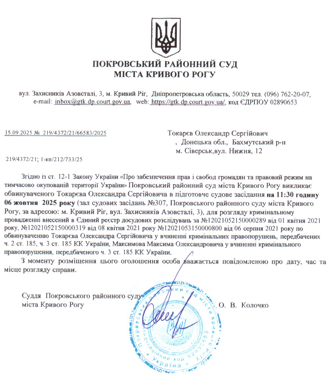 Оголошення про виклик до суду Токарєва Олександра Сергійовича