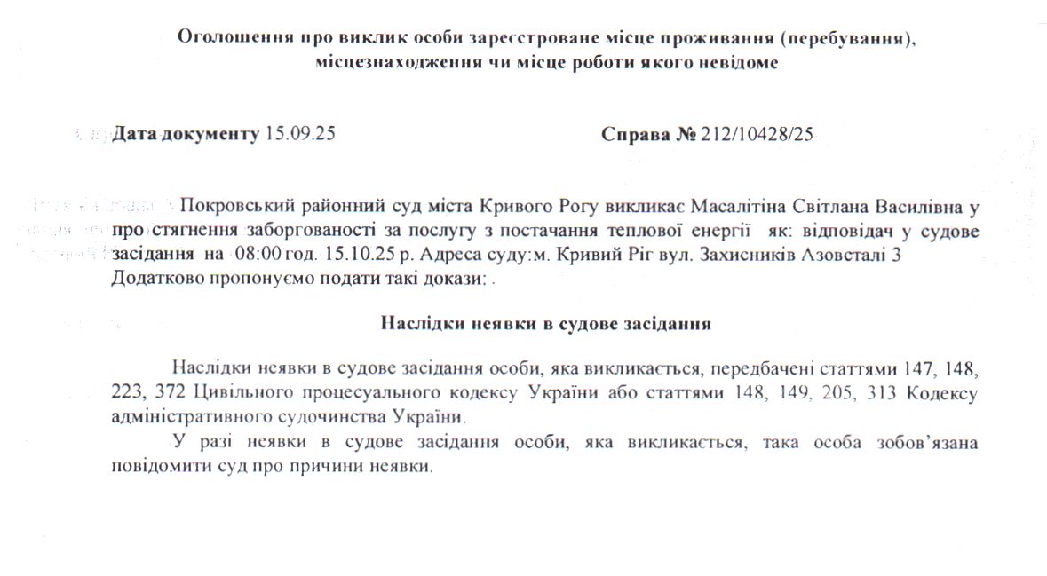 Оголошення про виклик до суду Масалітіної Світлани Василівни