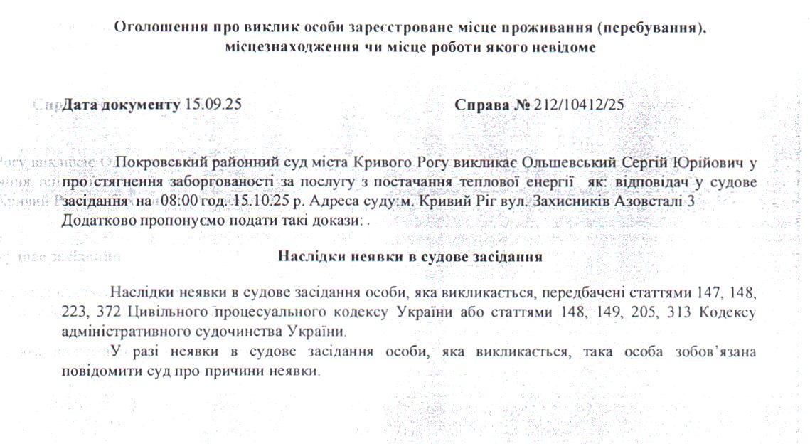 Оголошення про виклик до суду Ольшевського Сергія Юрійовича
