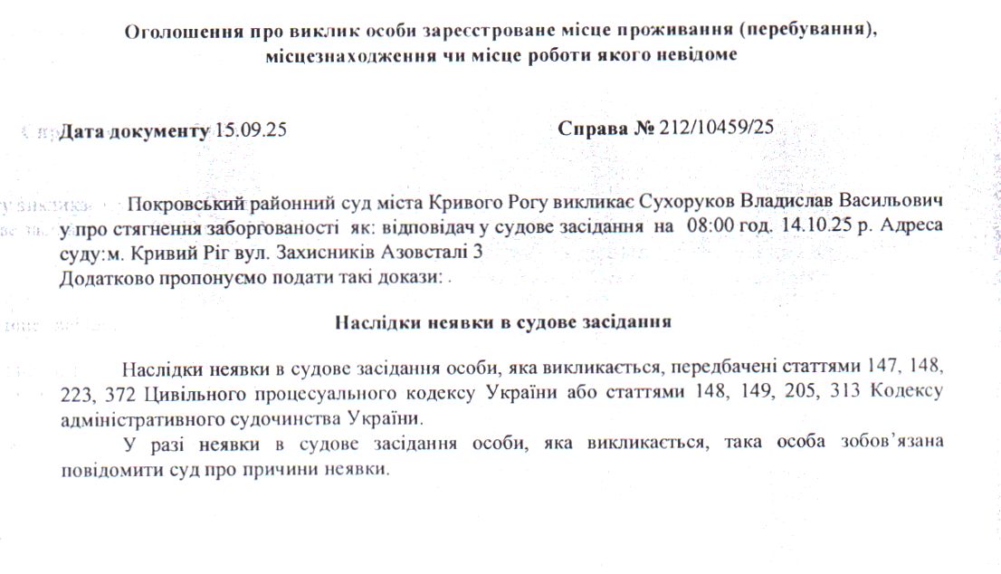 Оголошення про виклик до суду Сухорукова Владислава Васильовича