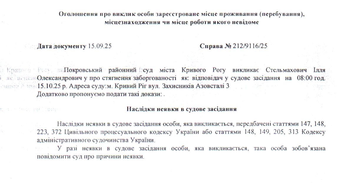 Оголошення про виклик до суду Стельмаховича Іллі Олександровича