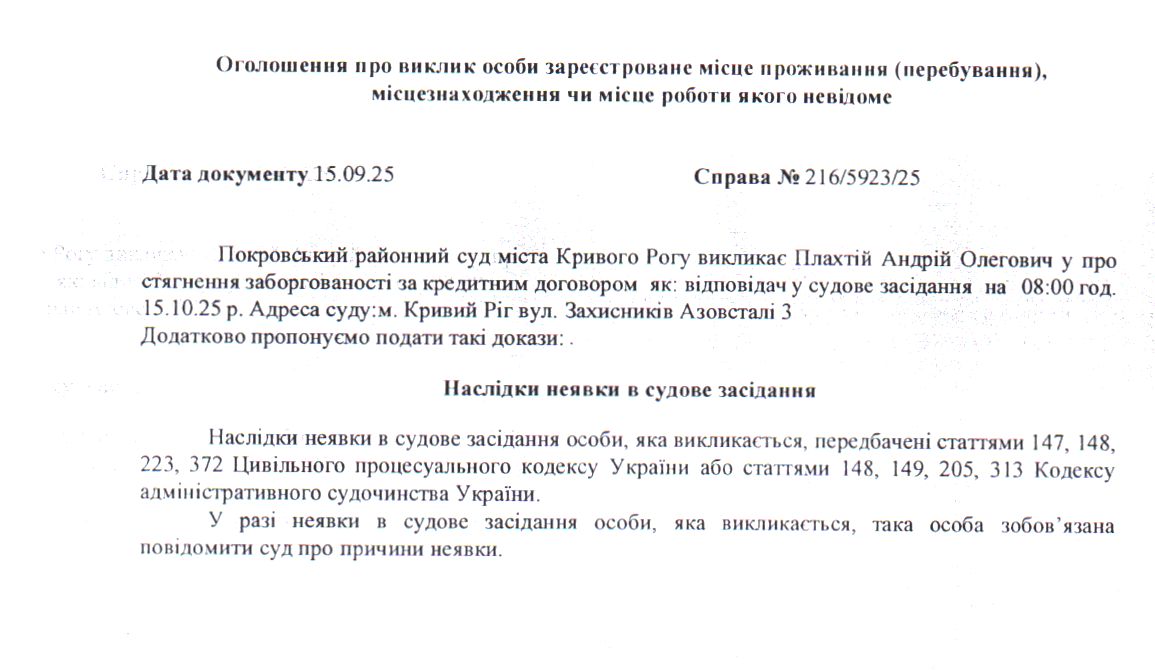 Оголошення про виклик до суду Плахтія Андрія Олеговича