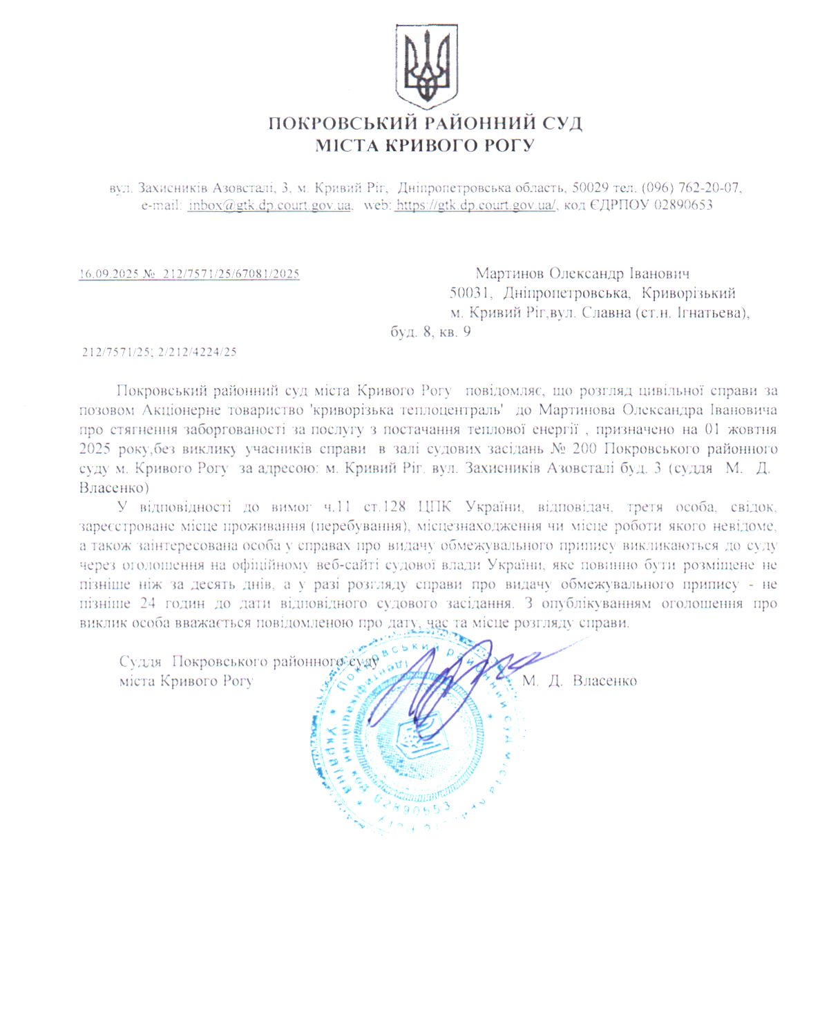 Оголошення про виклик до суду Мартинова Олександра Івановича