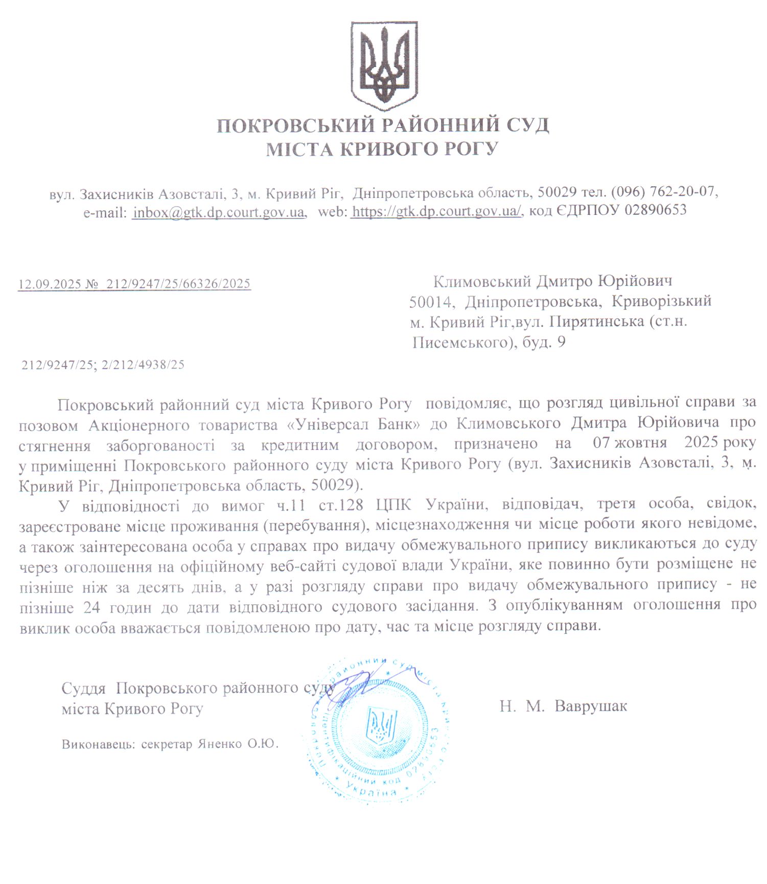 Оголошення про виклик до суду Климовського Дмитра Юрійовича