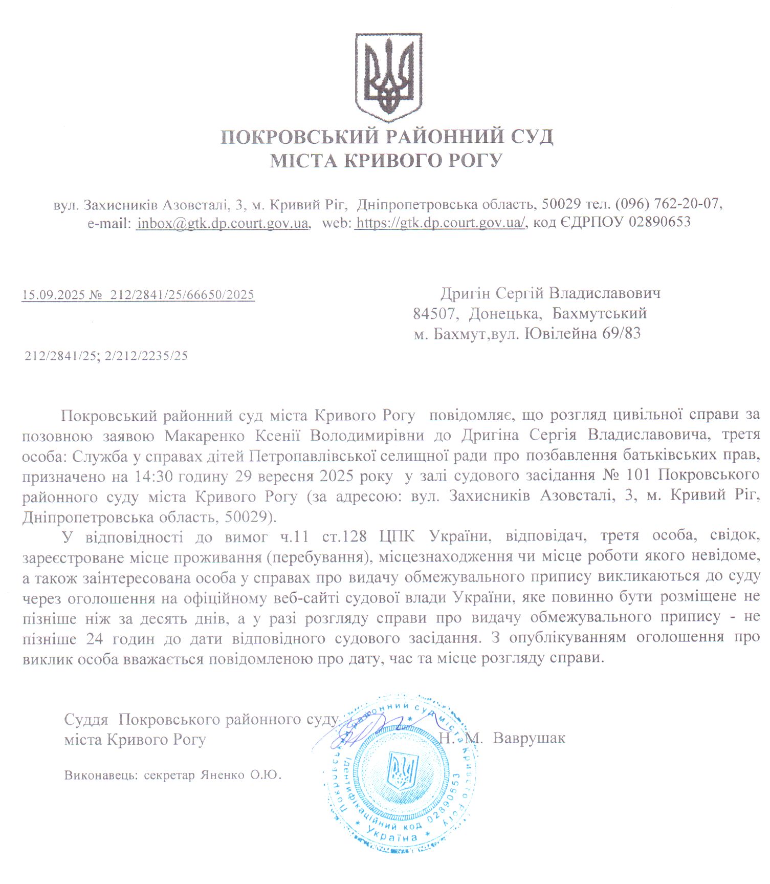 Оголошення про виклик до суду Дригіна Сергія Владиславовича