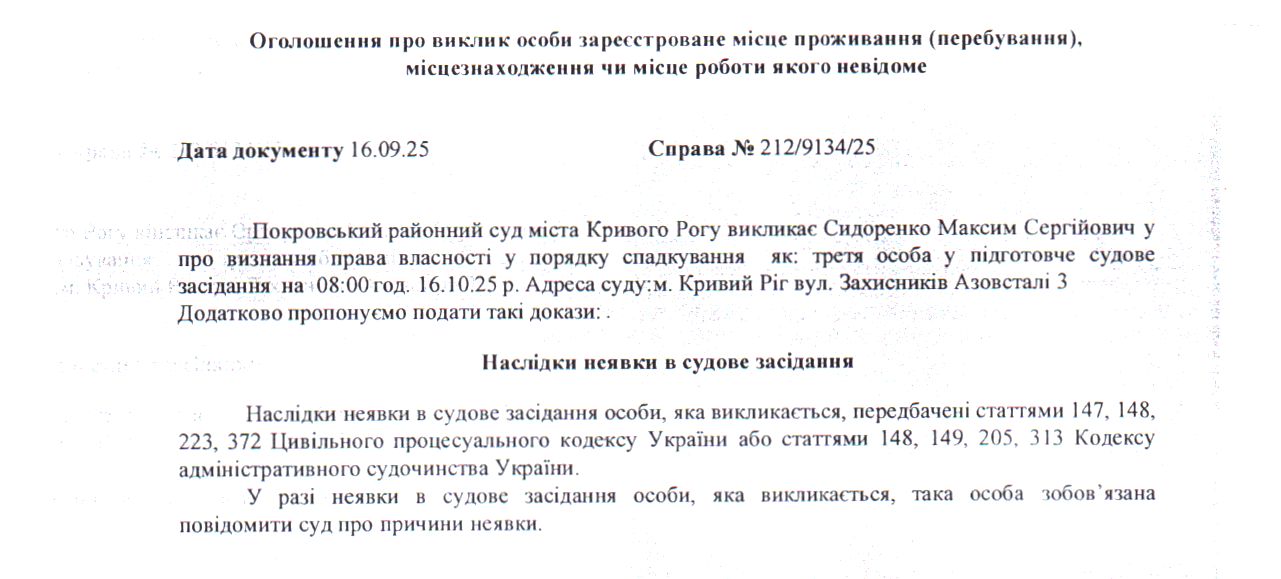 Оголошення про виклик до суду Сидоренка Максима Сергійовича