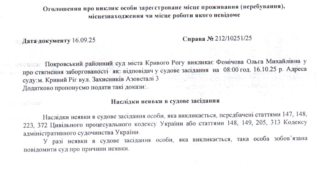 Оголошення про виклик до суду Фомічової Ольги Михайлівни