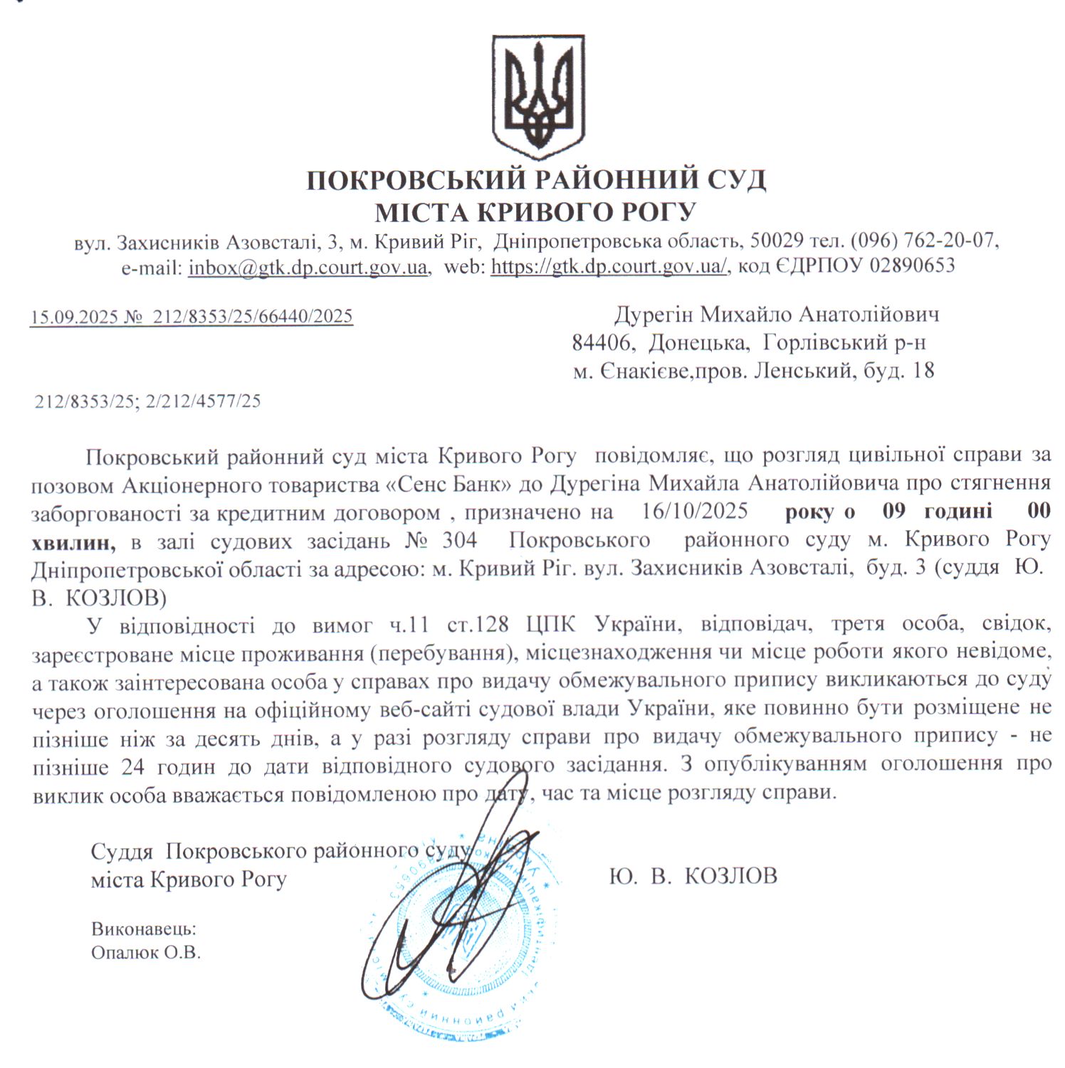 Оголошення про виклик до суду Дурегіна Михайла Анатолійовича