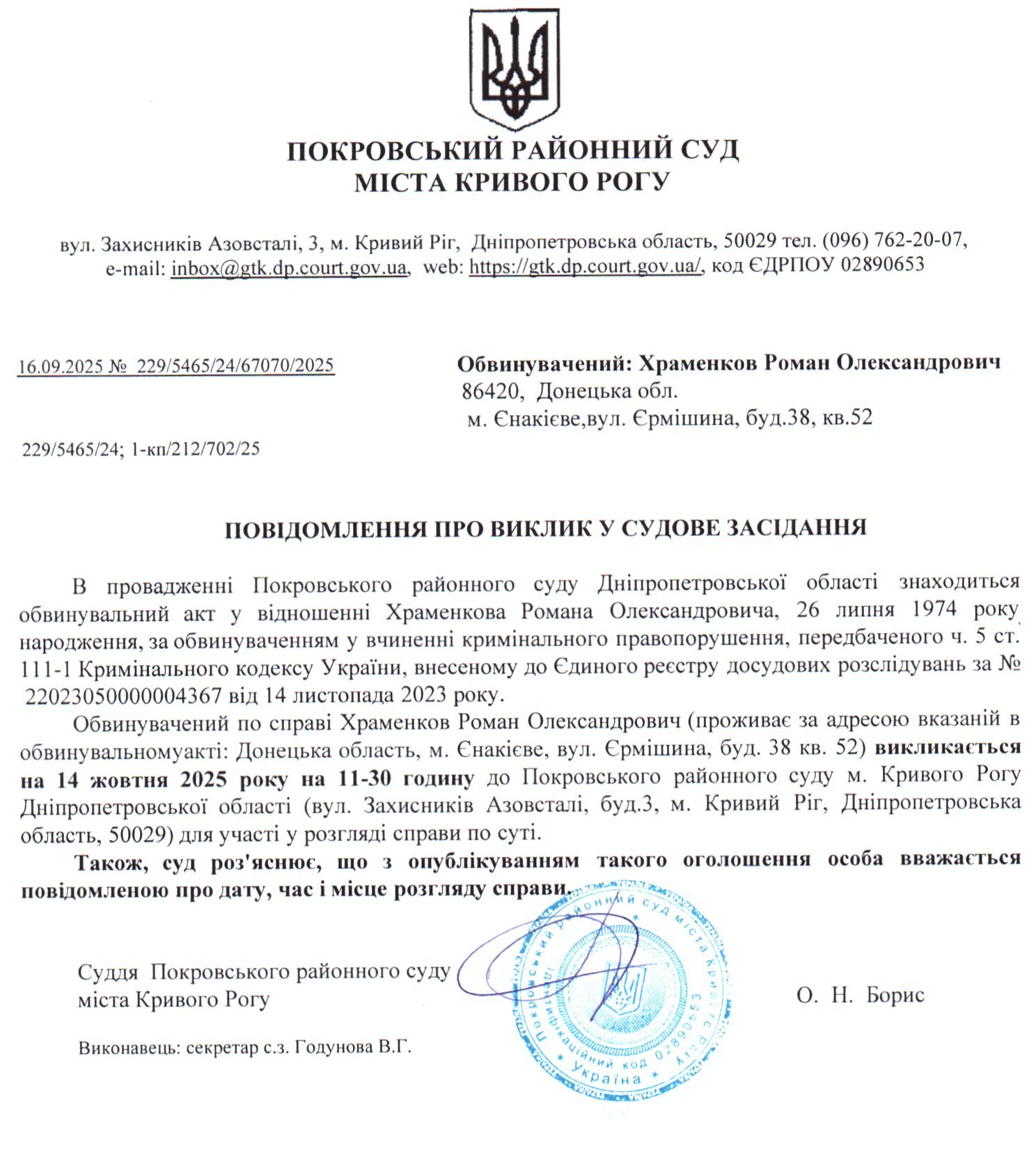 Оголошення про виклик до суду Храменкова Романа Олександровича