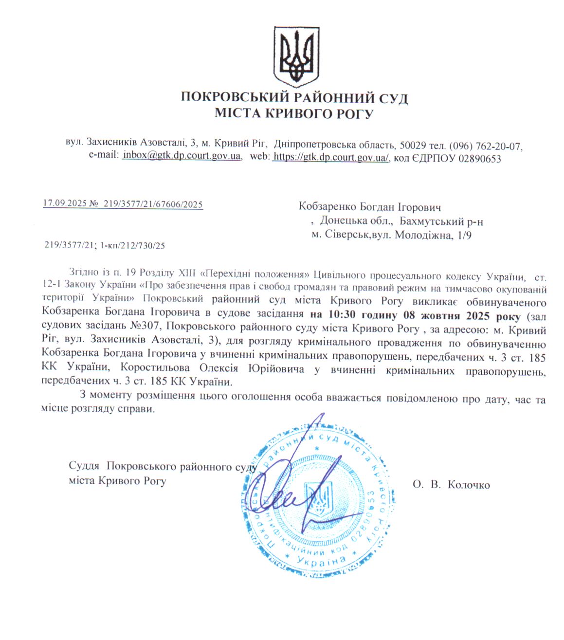 Оголошення про виклик до суду Кобзаренка Богдана Ігоровича