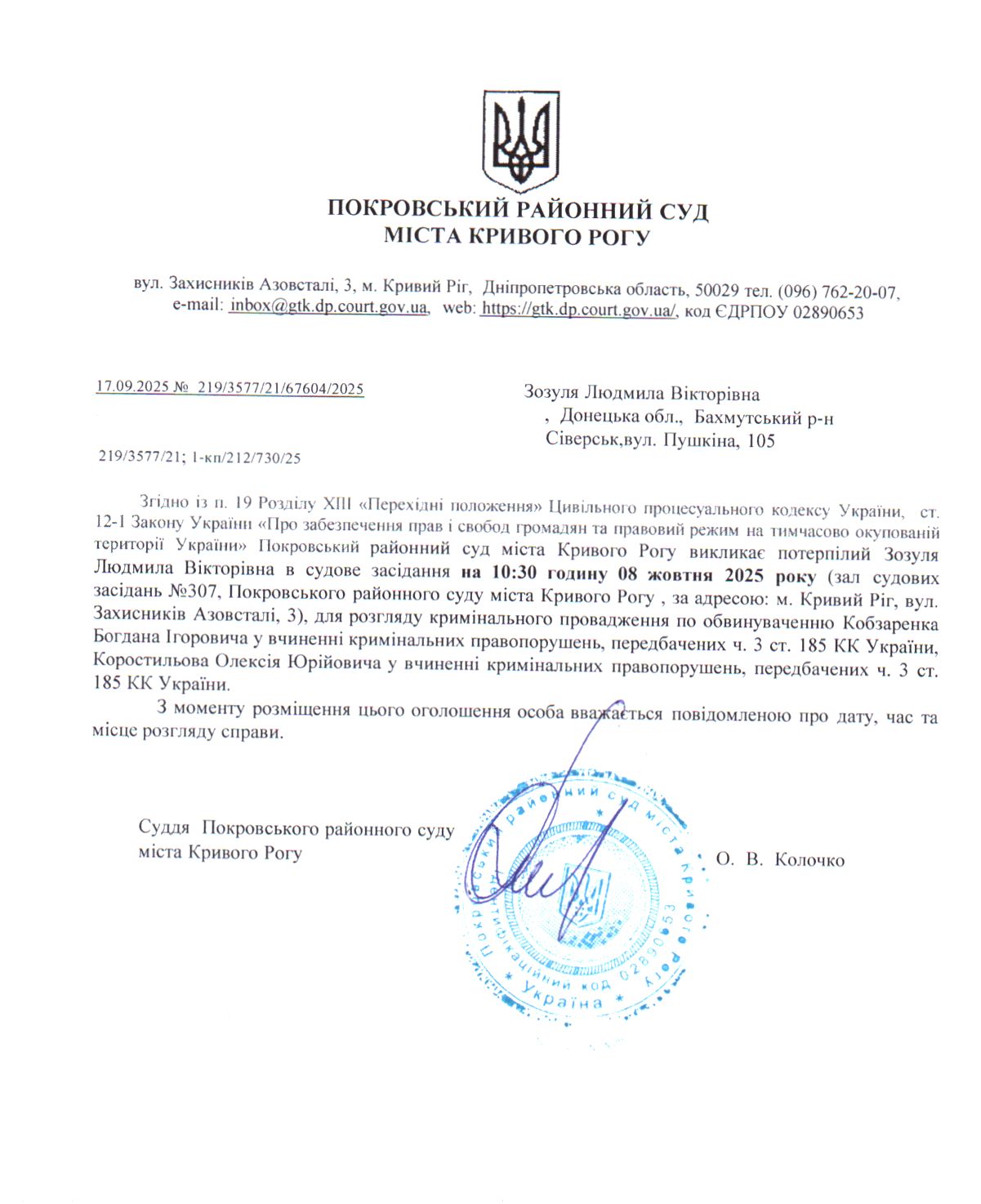 Оголошення про виклик до суду Зозулі Людмили Вікторівни