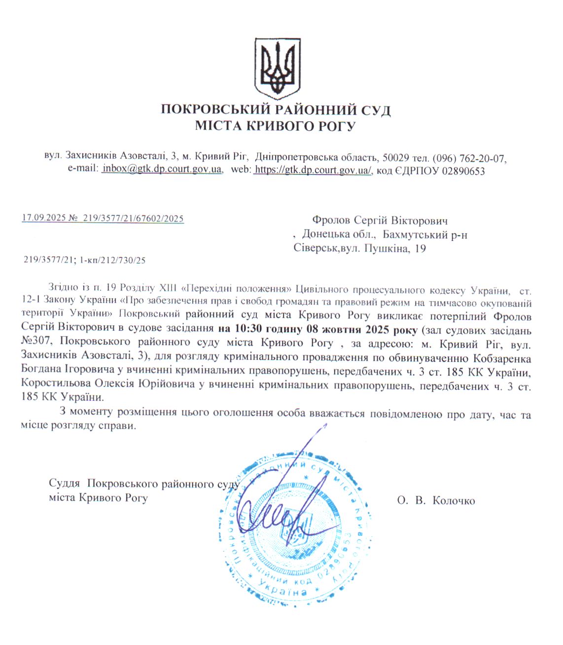 Оголошення про виклик до суду Фролова Сергія Вікторовича