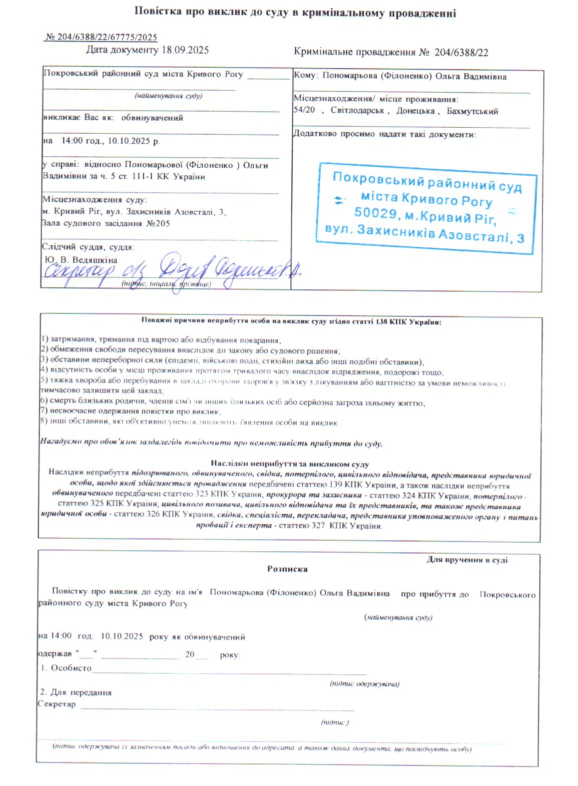 Оголошення про виклик до суду Пономарьової (Філоненко) Ольги Вадимівни