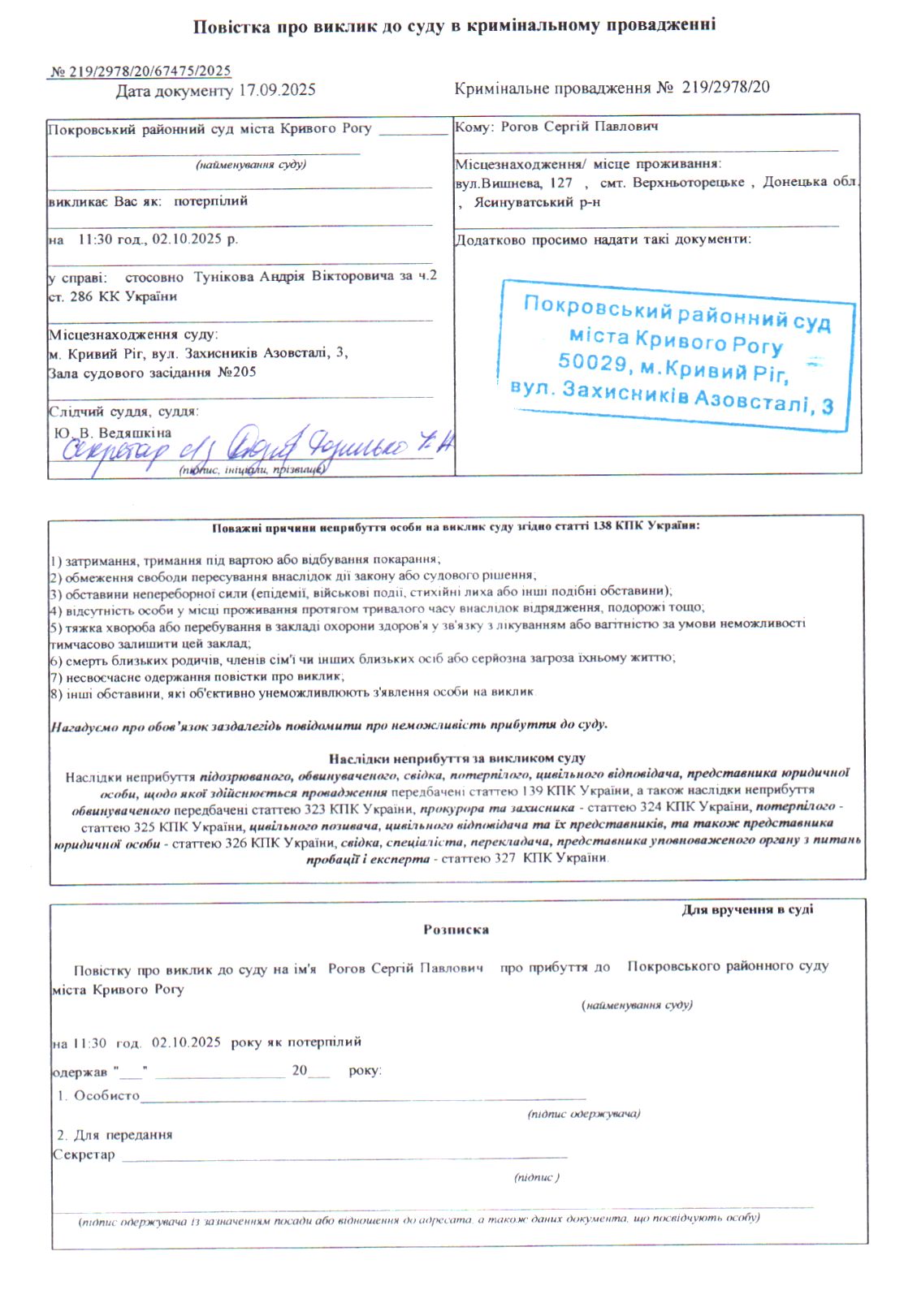 Оголошення про виклик до суду Рогова Сергія Павловича
