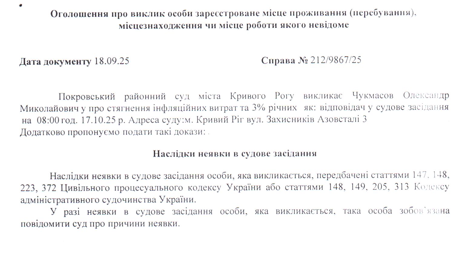 Оголошення про виклик до суду Чукмасова Олександра Миколайовича