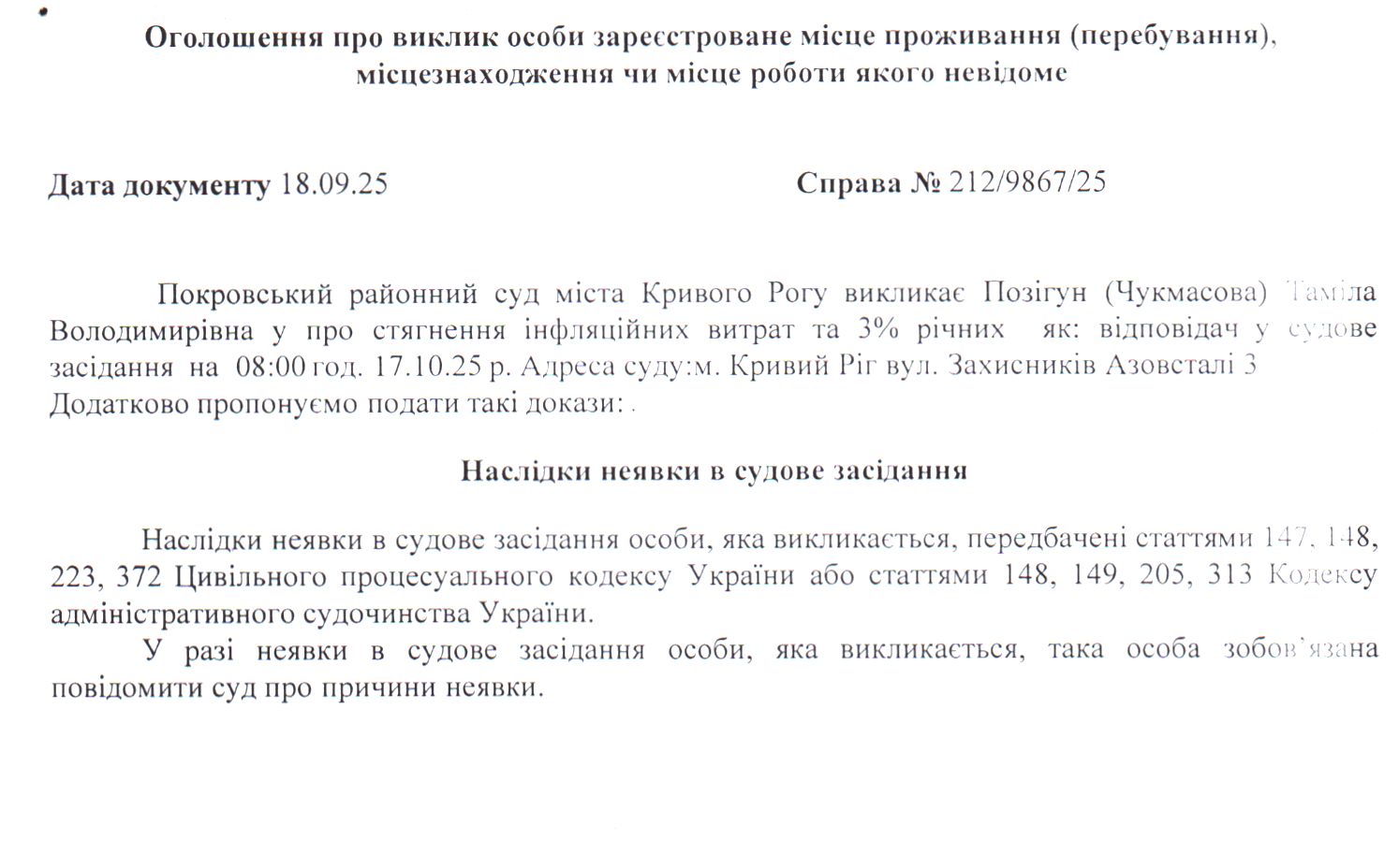 Оголошення про виклик до суду Позігун (Чукмавсової) Таміли Володимирівни