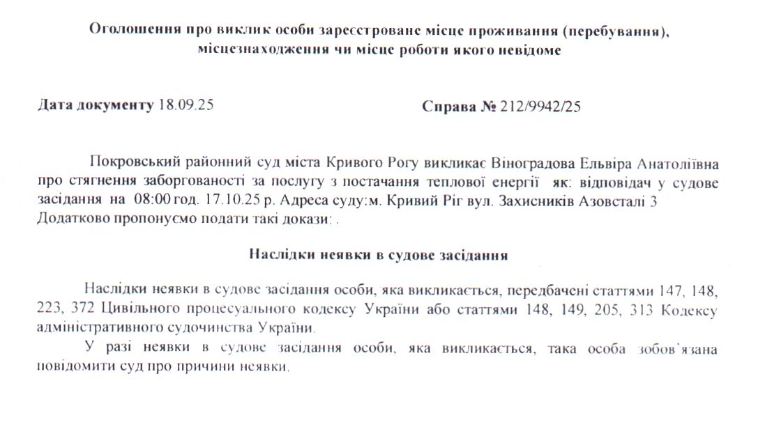 Оголошення про виклик до суду Виноградової Ельвіри Анатоліївни