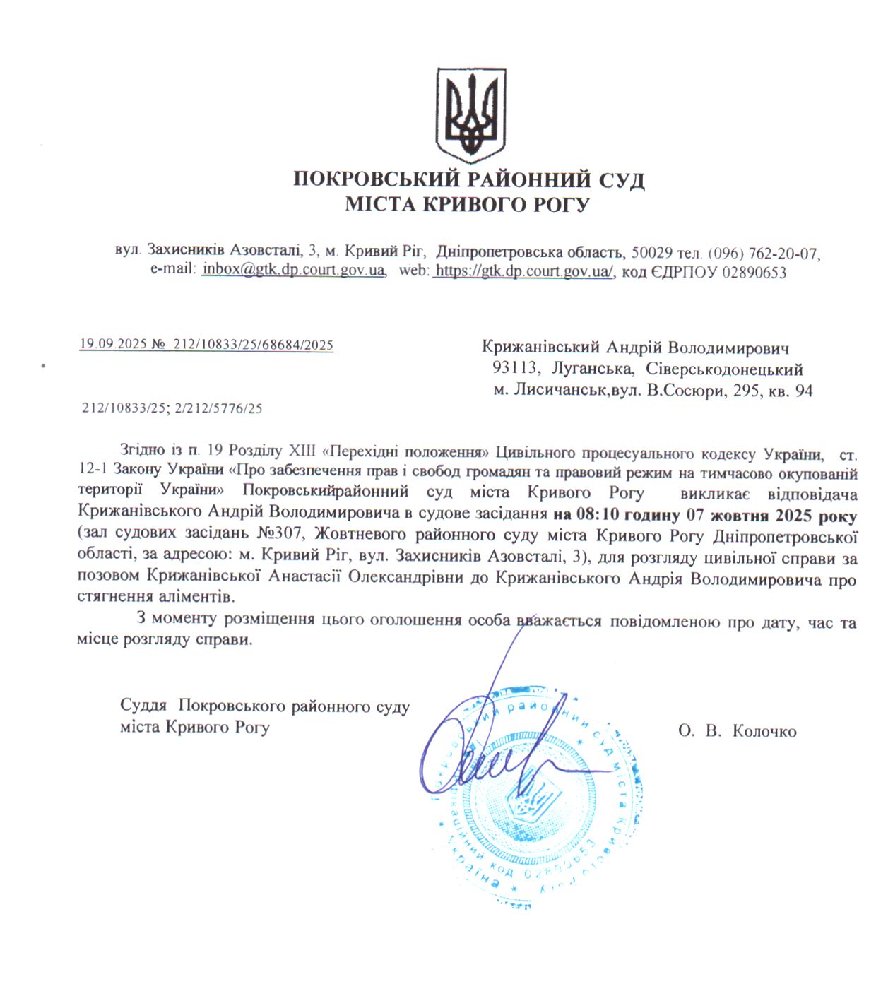 Оголошення про виклик до суду Крижанівського Андрія Володимировича