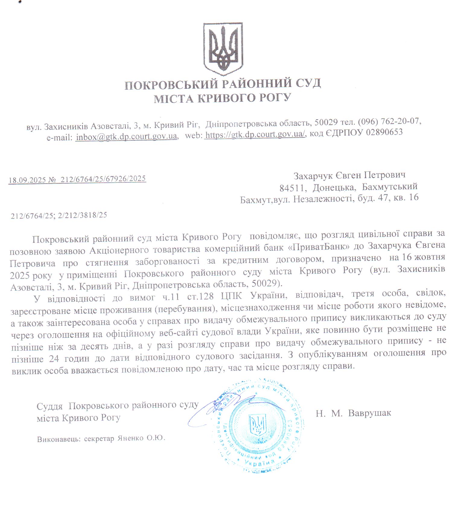 Оголошення про виклик до суду Захарчука Євгена Петровича