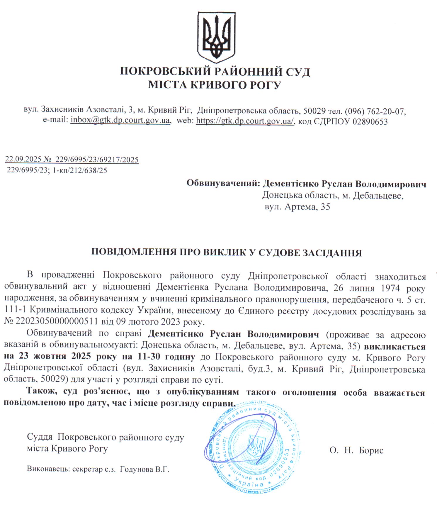 Оголошення про виклик до суду Дементієнка Руслана Володимировича