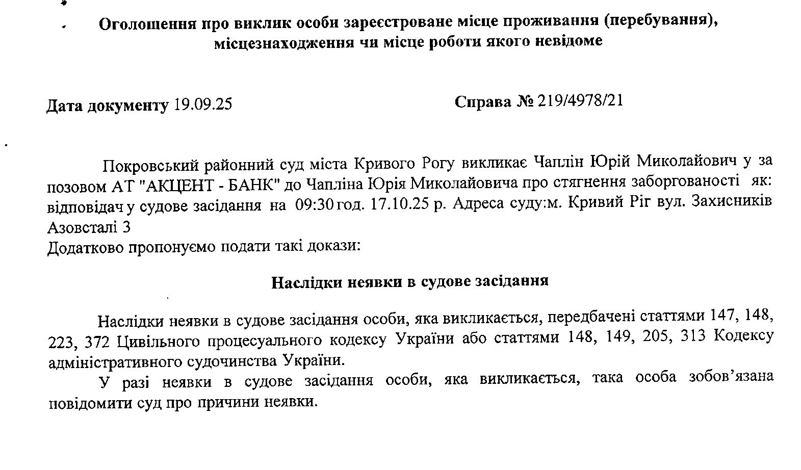 Оголошення про виклик до суду Чапліна Юрія Миколайовича