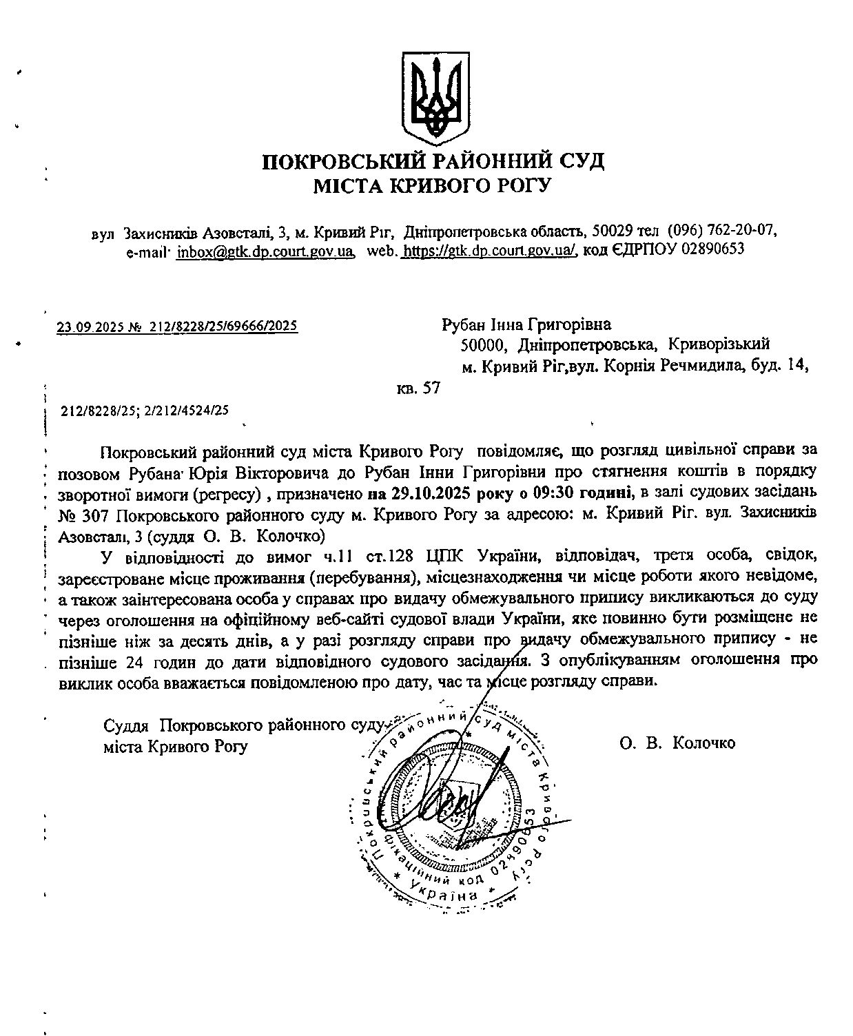 Оголошення про виклик до суду Рубан Інни Григорівни