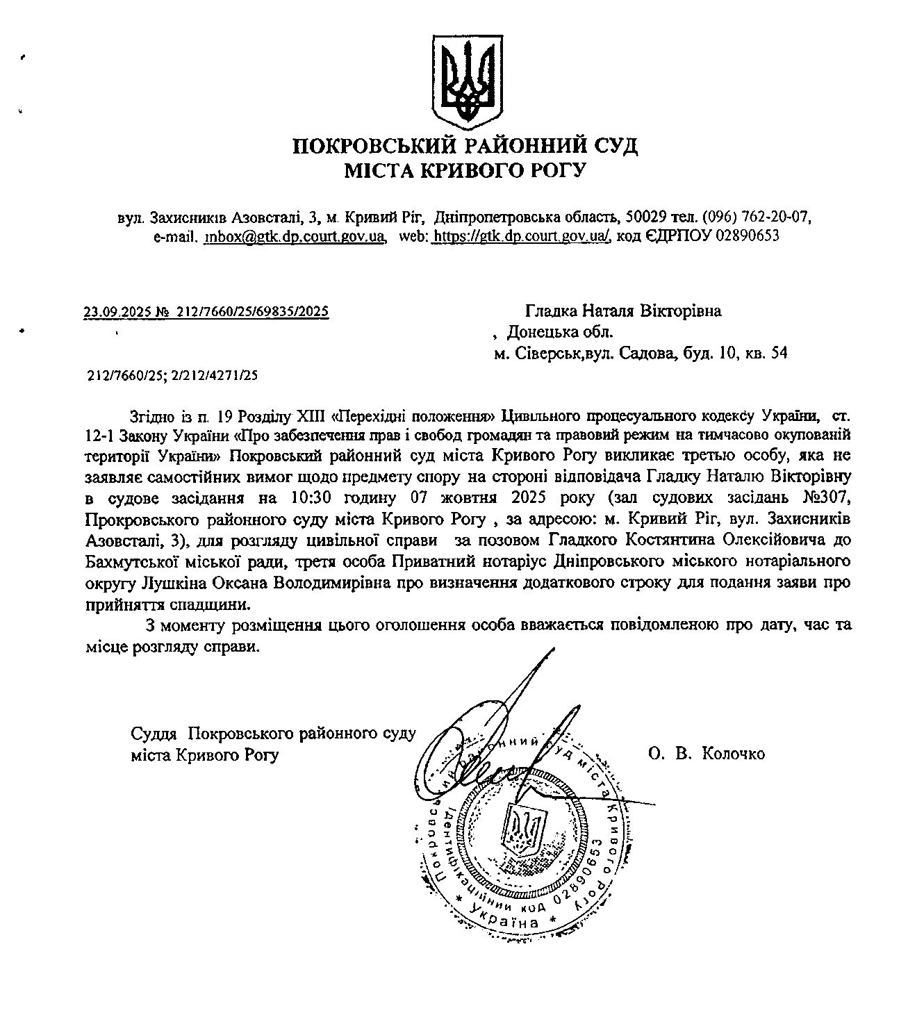 Оголошення про виклик до суду Гладкої Наталі Вікторівни