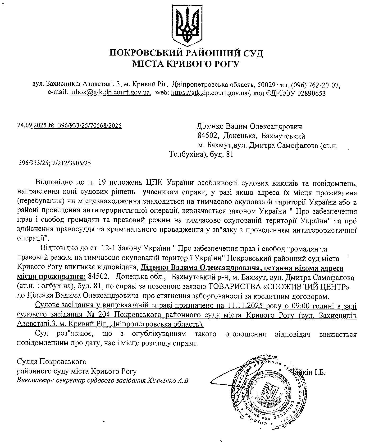 Оголошення про виклик до суду Діденка Вадима Олександровича