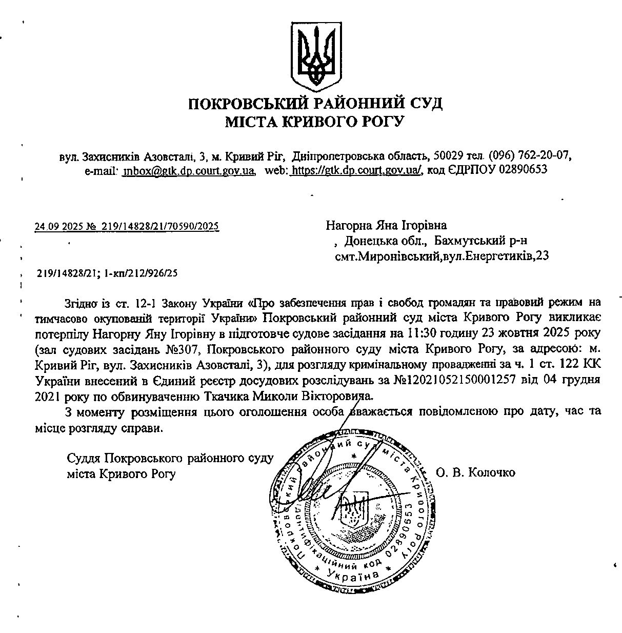 Оголошення про виклик до суду Нагорної Яни Ігорівни