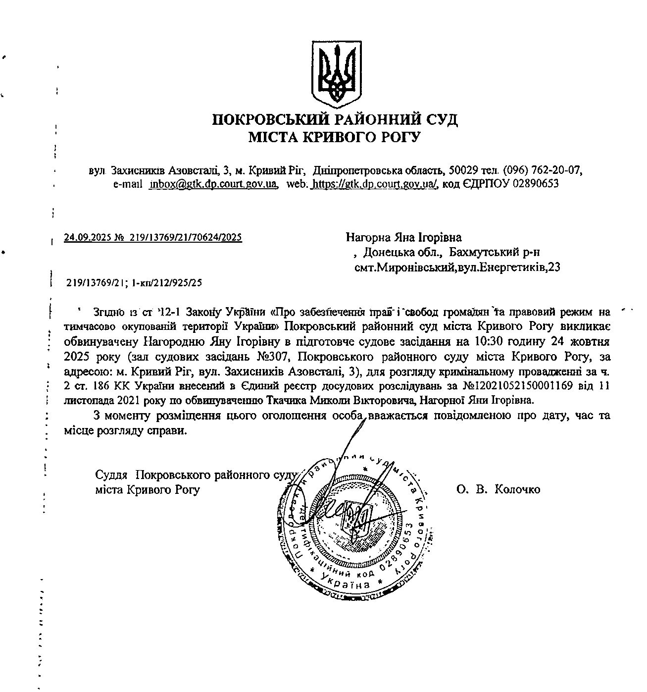 Оголошення про виклик до суду Нагорної Яни Ігорівни