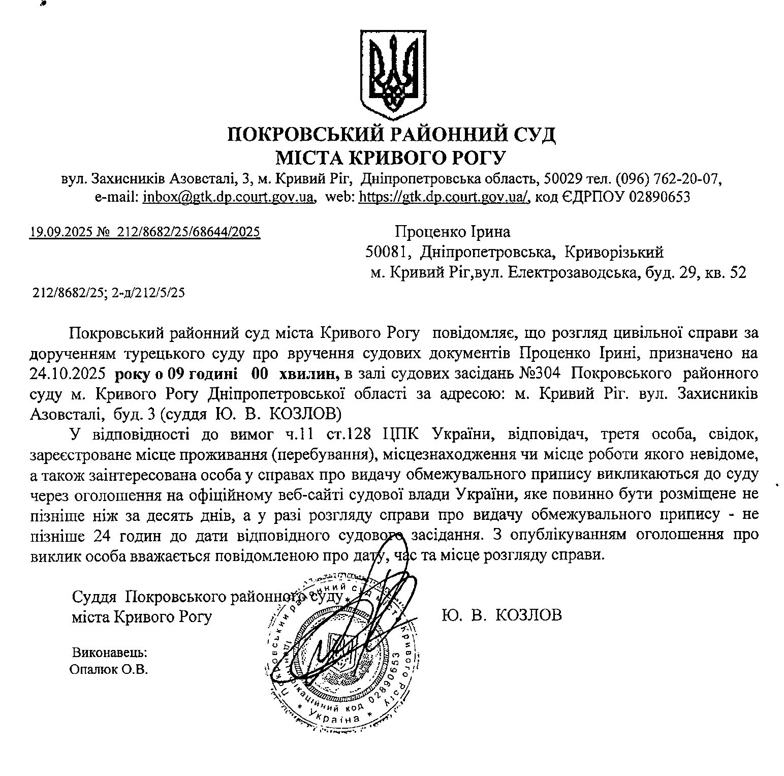 Оголошення про виклик до суду Проценко Ірини