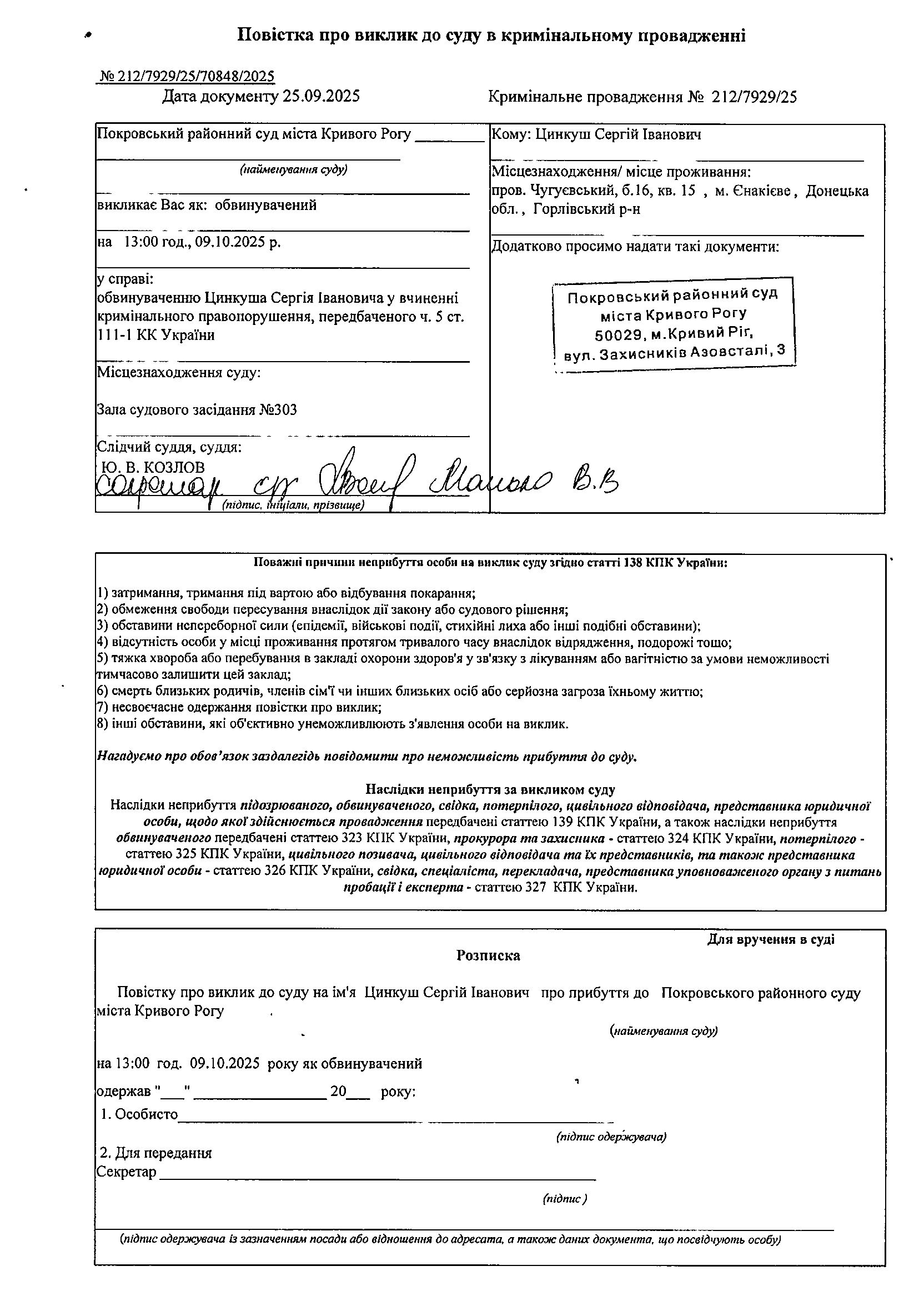 Оголошення про виклик до суду Цинкуша Сергія Івановича