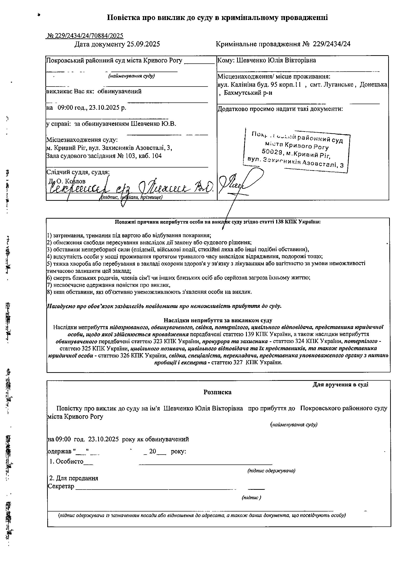 Оголошення про виклик до суду Шевченко Юлії Вікторівни