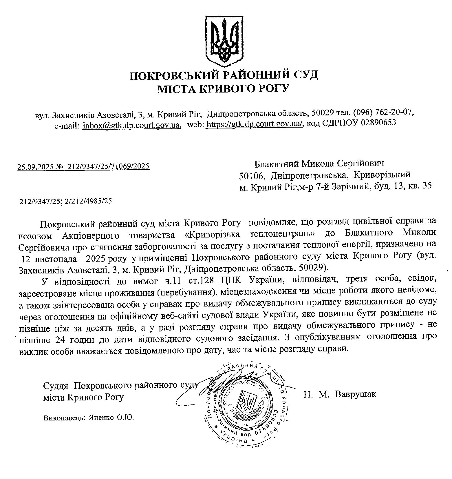 Оголошення про виклик до суду Блакитного Миколи Сергійовича