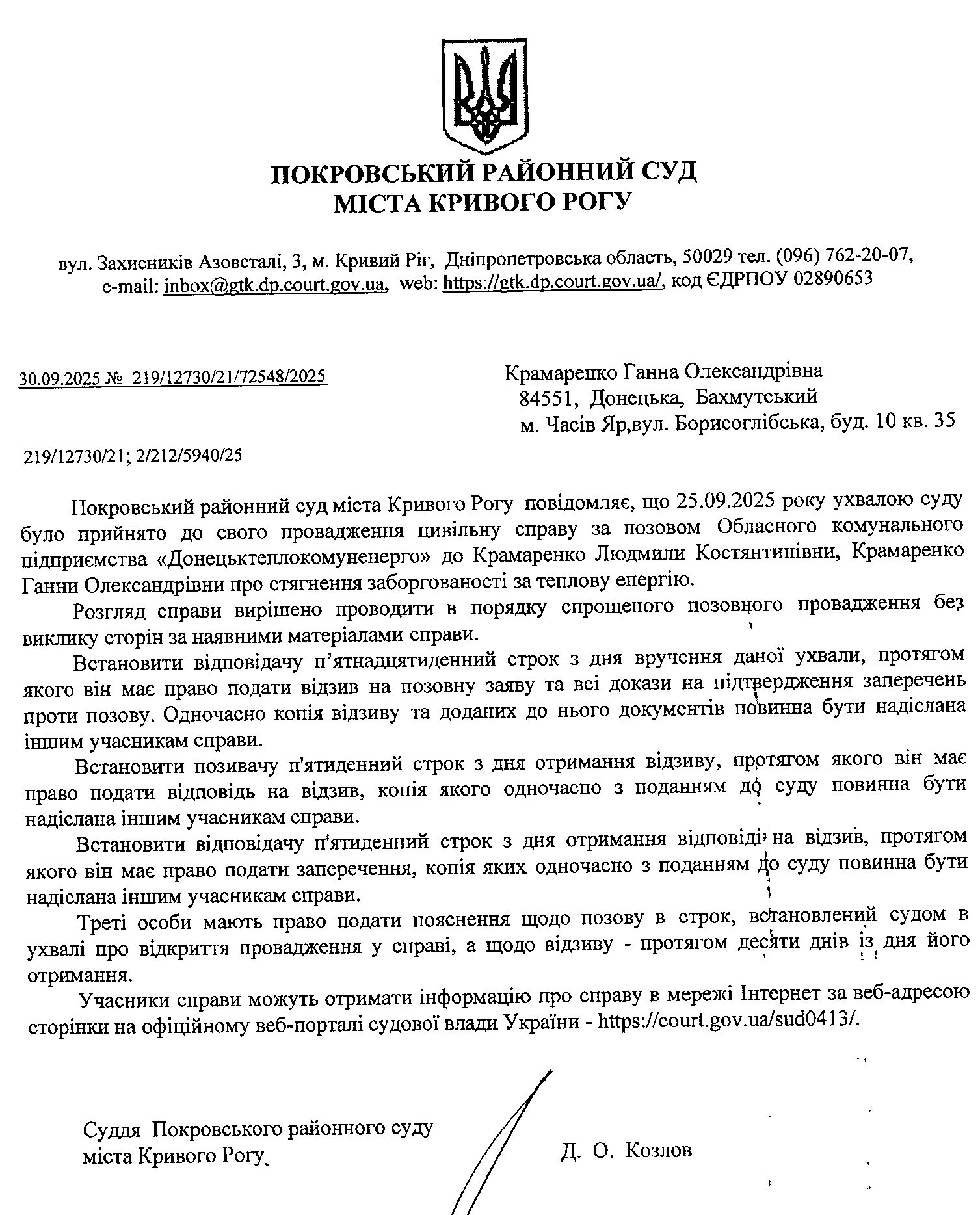 Оголошення про виклик до суду Крамаренко Ганни Олександрівни