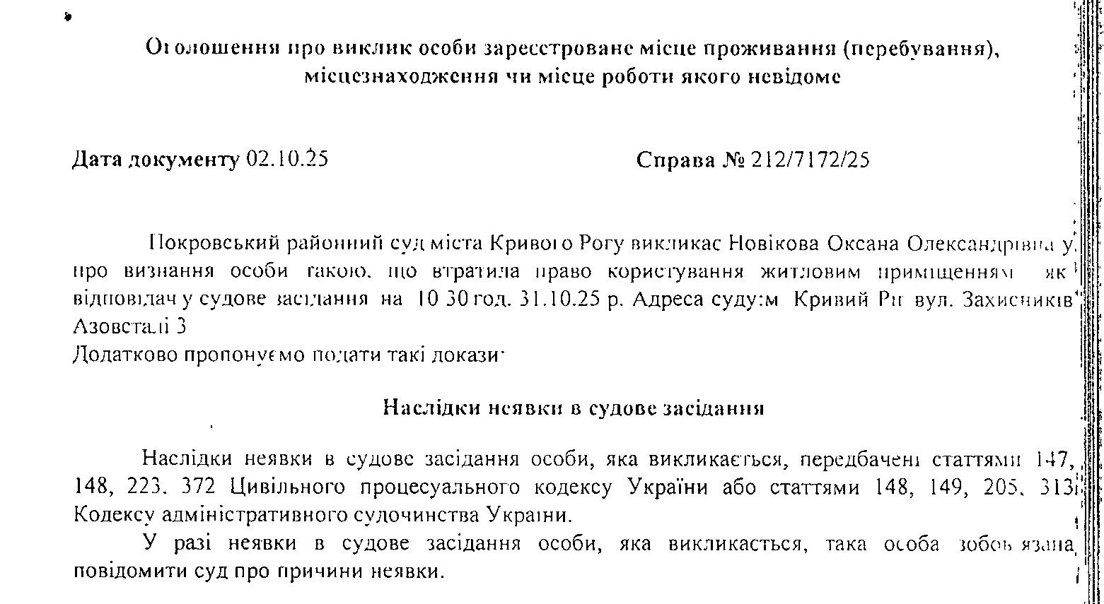 Оголошення про виклик до суду Новікової Оксани Олександрівни