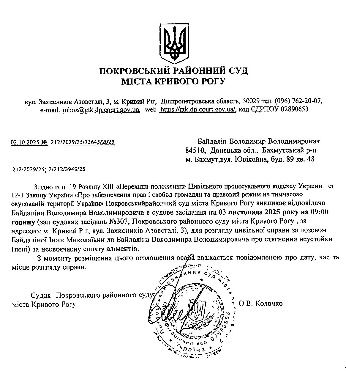 Оголошення про виклик до суду Байдаліна Володимира Володимировича