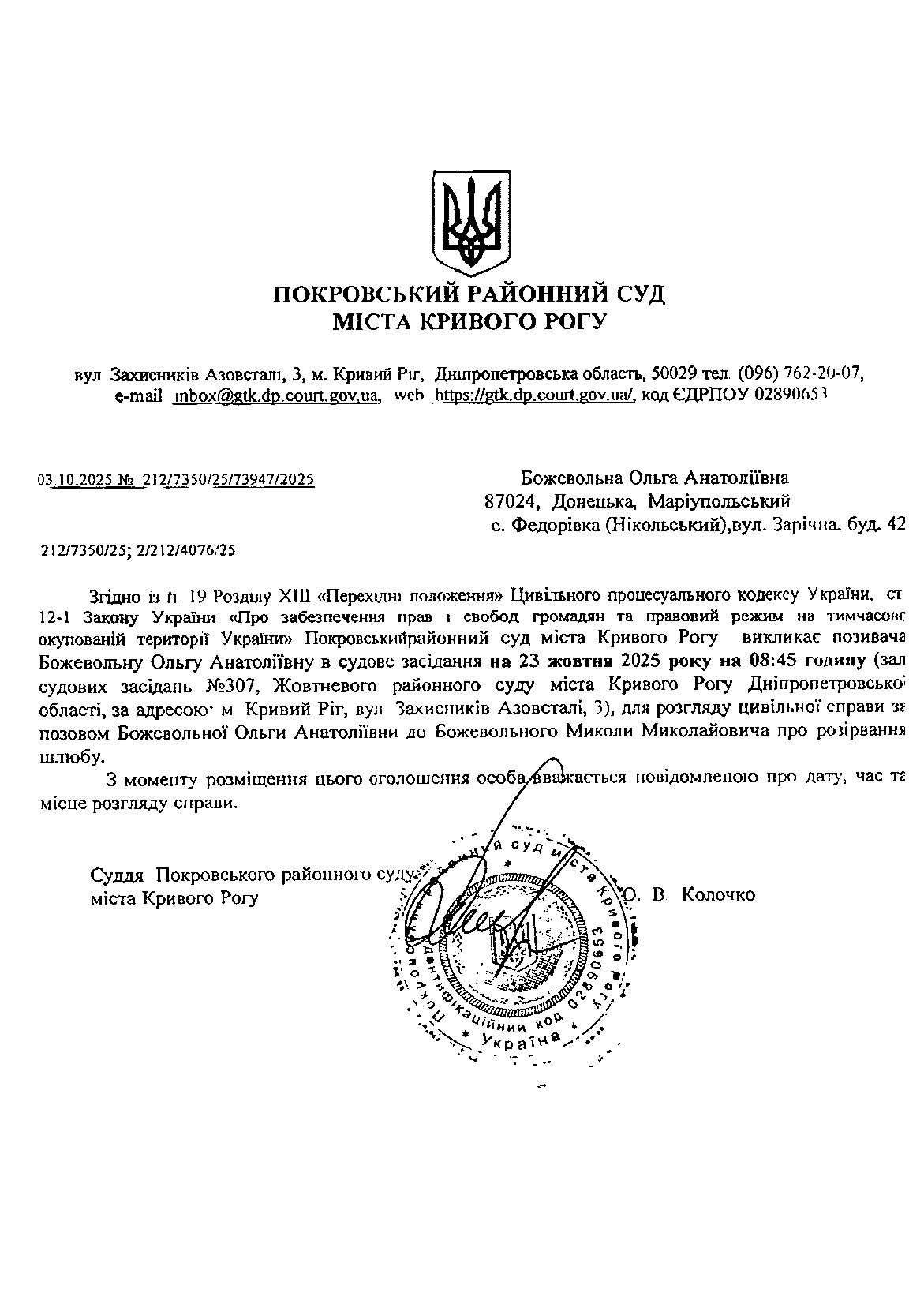 Оголошення про виклик до суду Божевольної Ольги Анатоліївни
