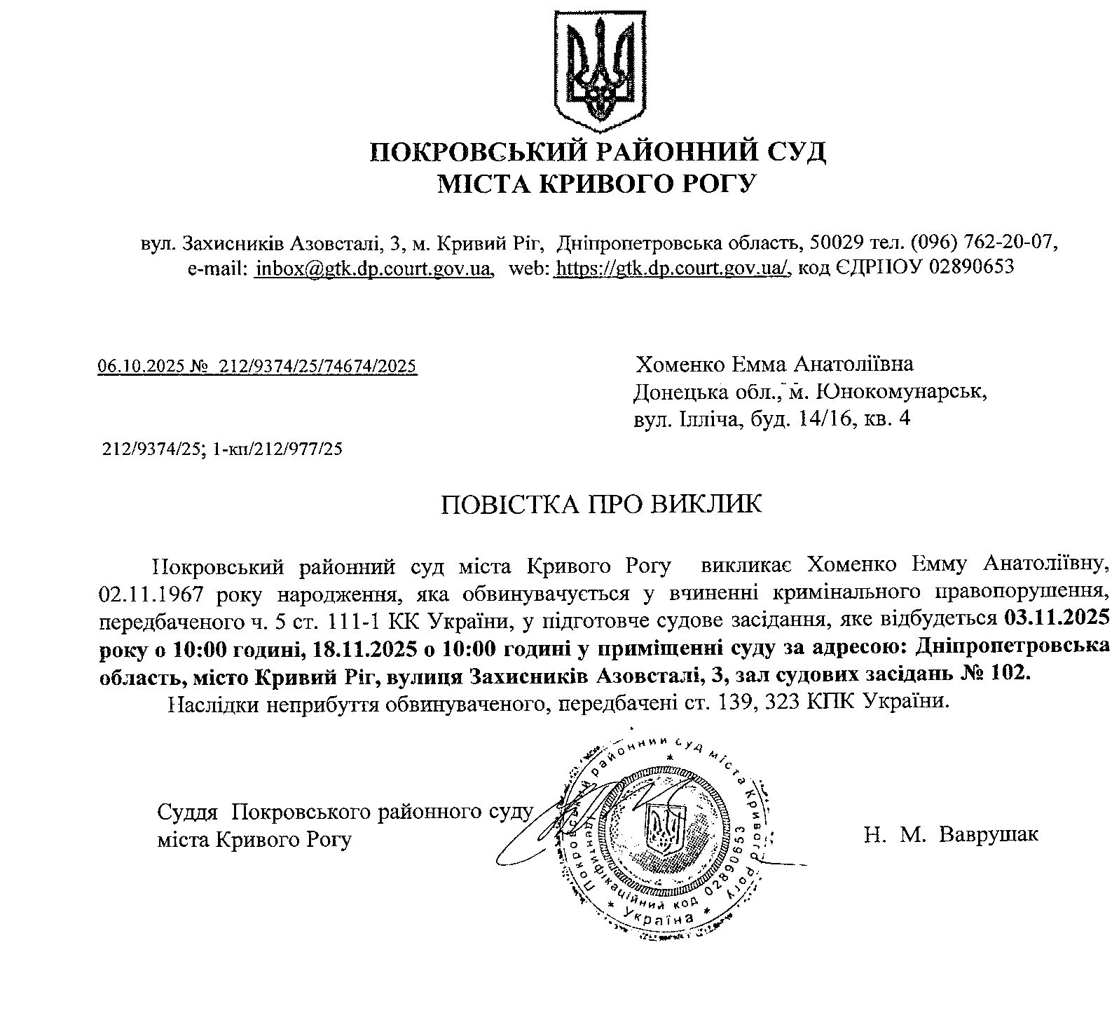 Оголошення про виклик до суду Хоменко Емми Анатоліївни