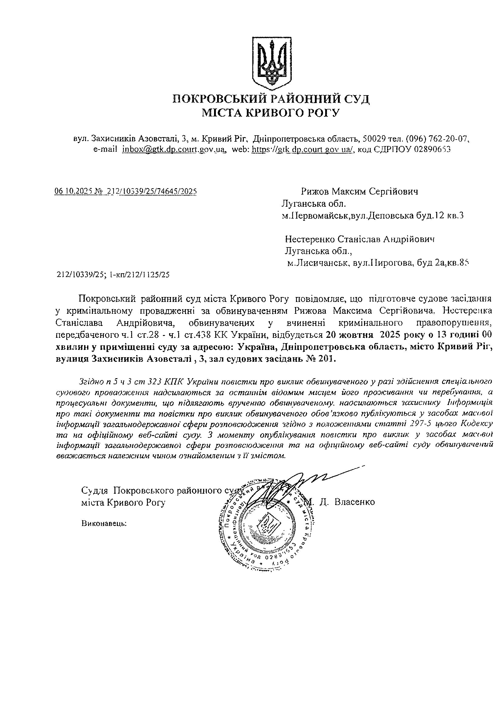 Оголошення про виклик до суду Рижова Максима Сергійовича, Нестеренка Станіслава Андрійовича