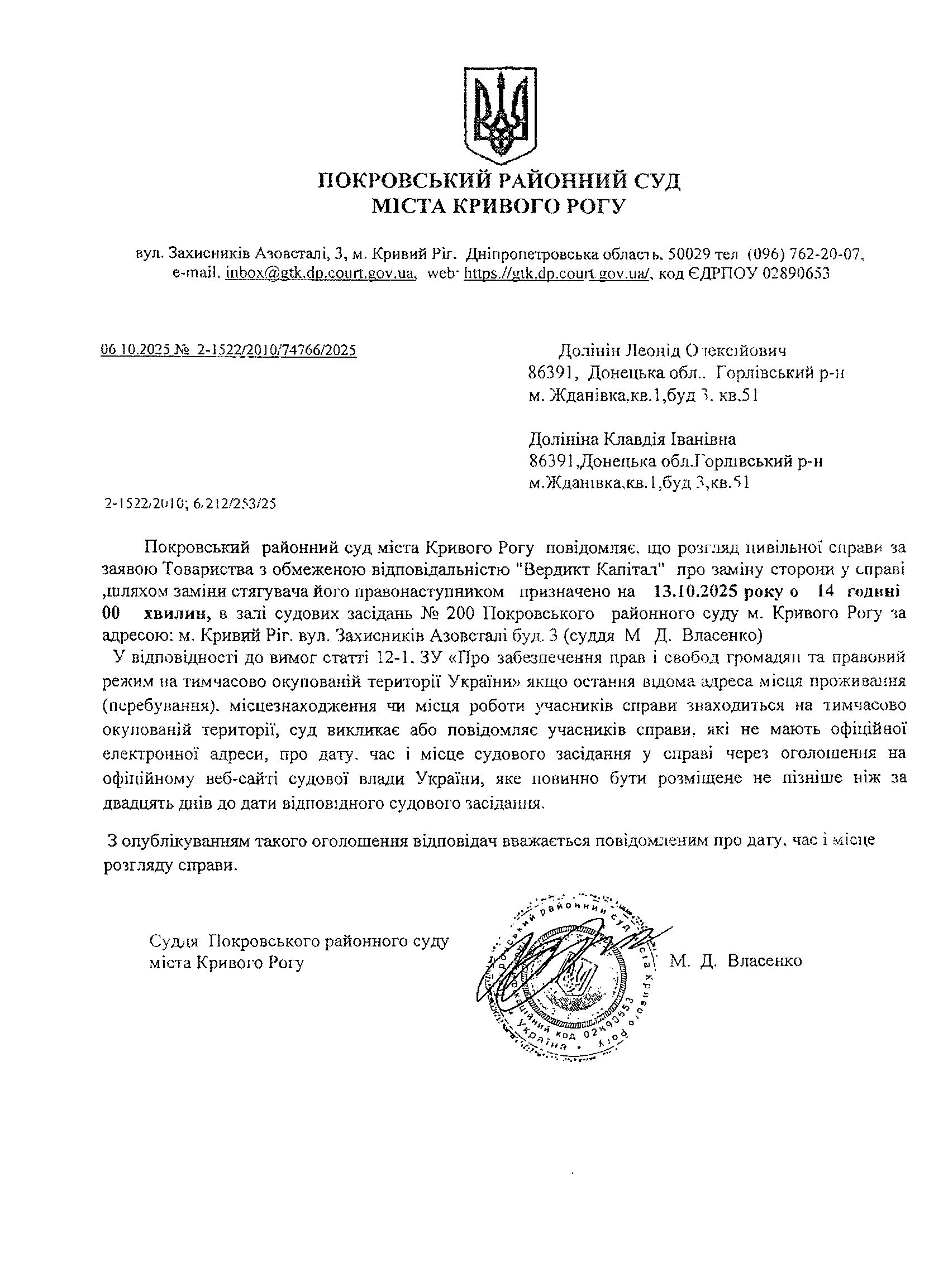 Оголошення про виклик до суду Долініна Леоніда Олексійовича, Долініної Клавдії Іванівни
