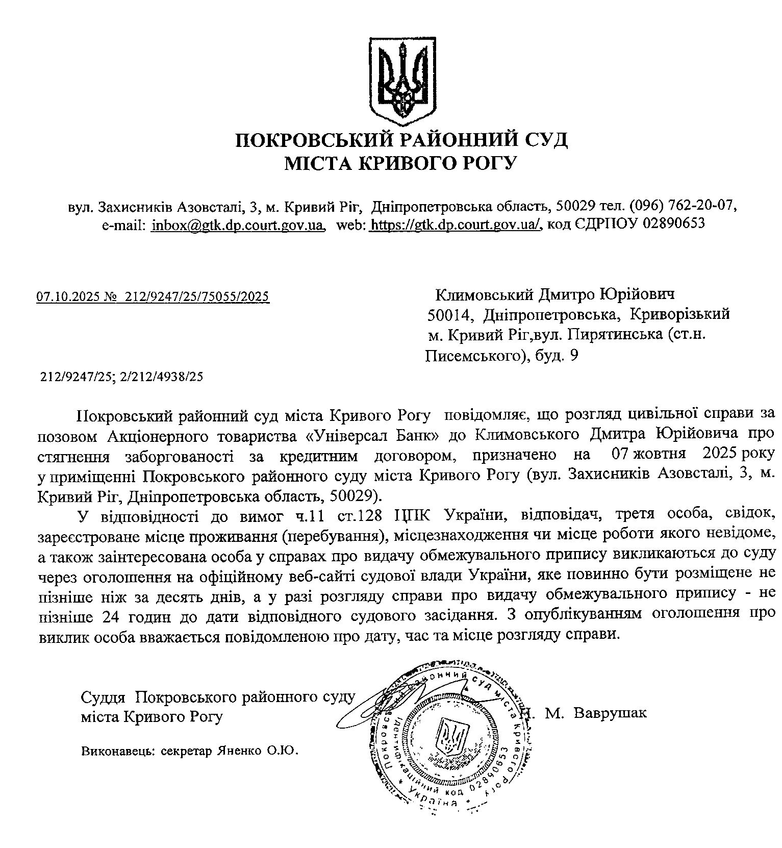 Оголошення про виклик до суду Климовського Дмитра Юрійовича